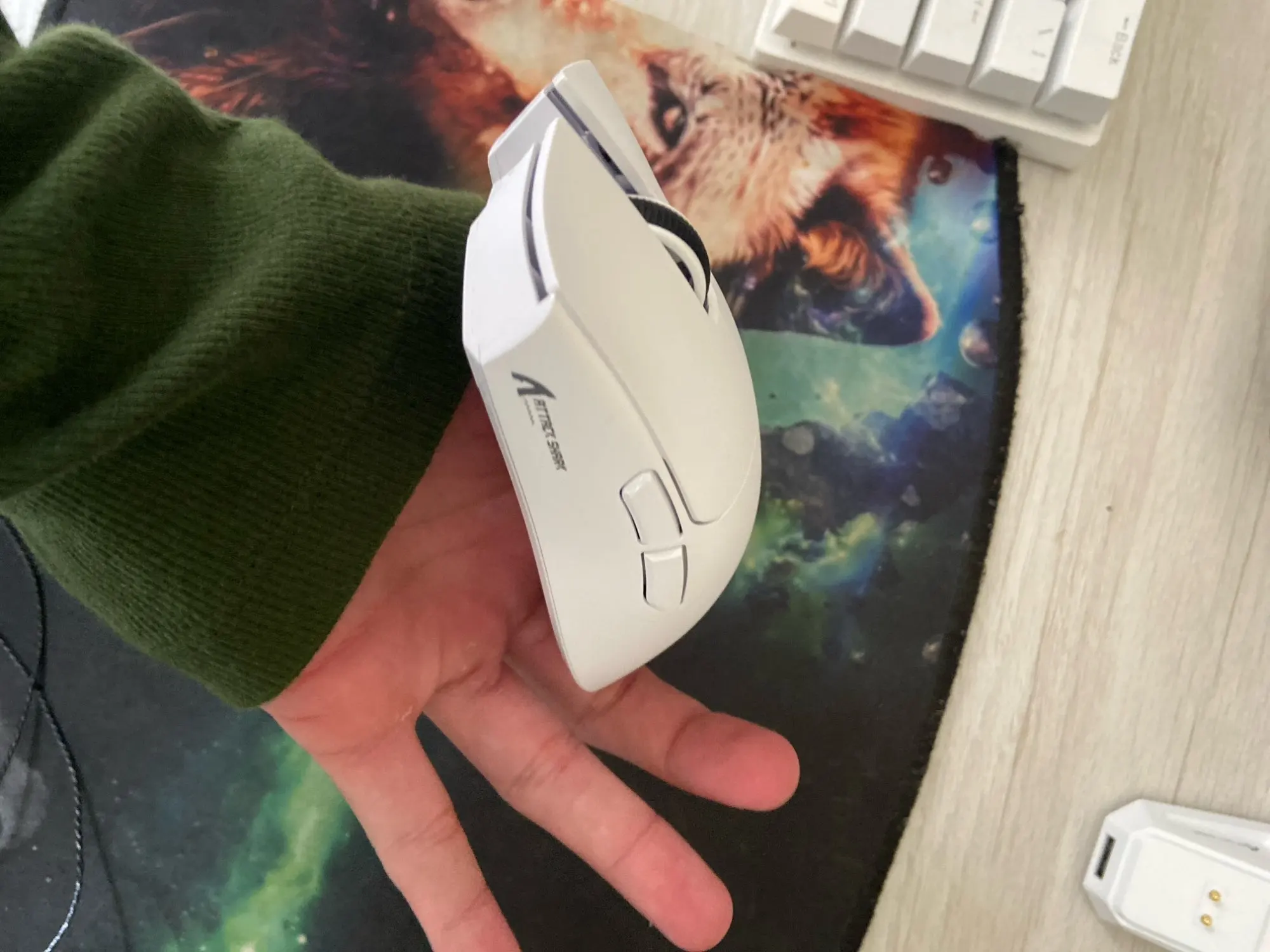 Very good mouse, much lighter than I expected. I had a scare compared to my old one (office) due to the size and weight. At first, I had difficulty adjusting the DPI, which is located under the mouse, but I downloaded the software and resolved it easily. I did a polling rate test and it averaged 857, and in my first day of use I didn't experience any delay (using only the cable). I did not have the chance to test via Bluetooth and the 'pen-drive' (I am not familiar with the name). Finally, the delivery arrived 8 days earlier than expected, but the box came slightly crushed and even partially open. However, the quality of everything was at the highest level I've ever seen, both the box and the stickers.