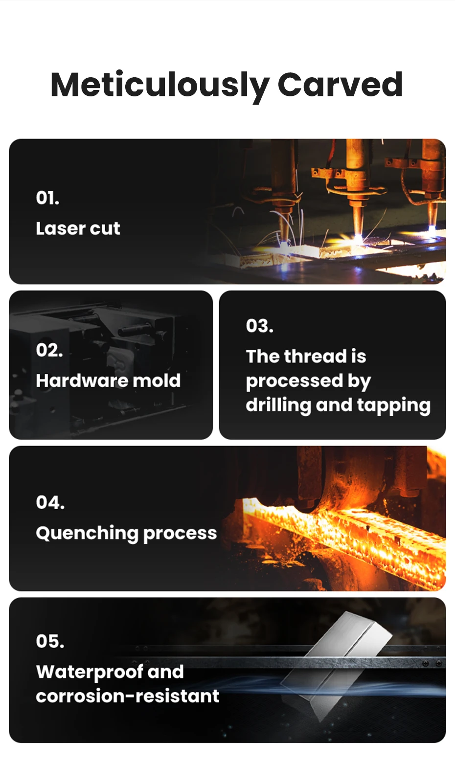 1. Laser cut 2.Hardware mold 3.The thread is processed by drilling and tapping 4.Quenching process 5.Waterproof and corrosion-resistant